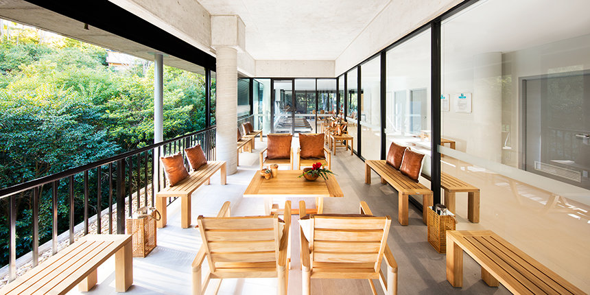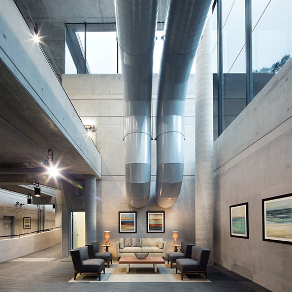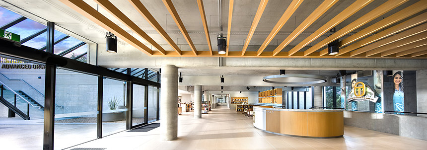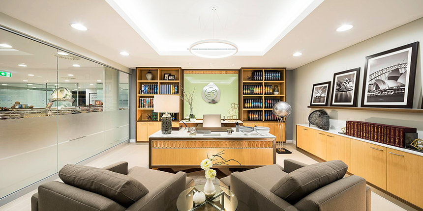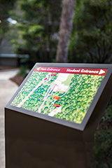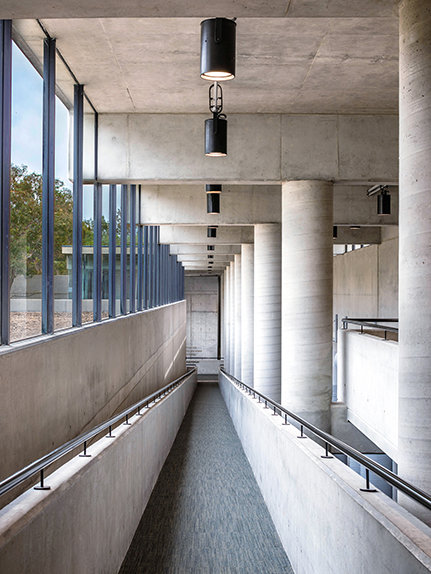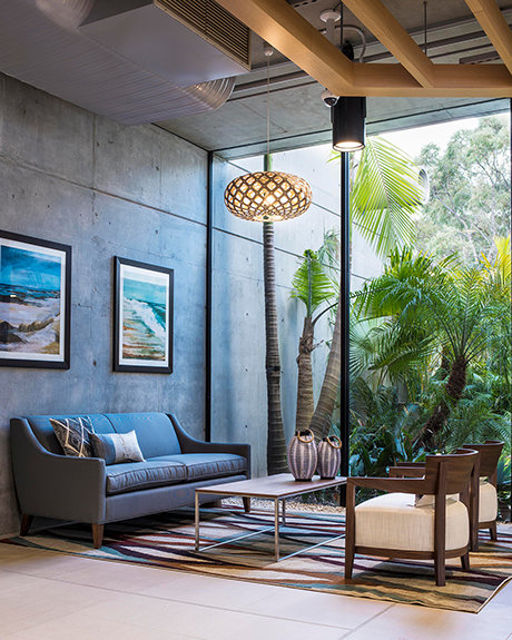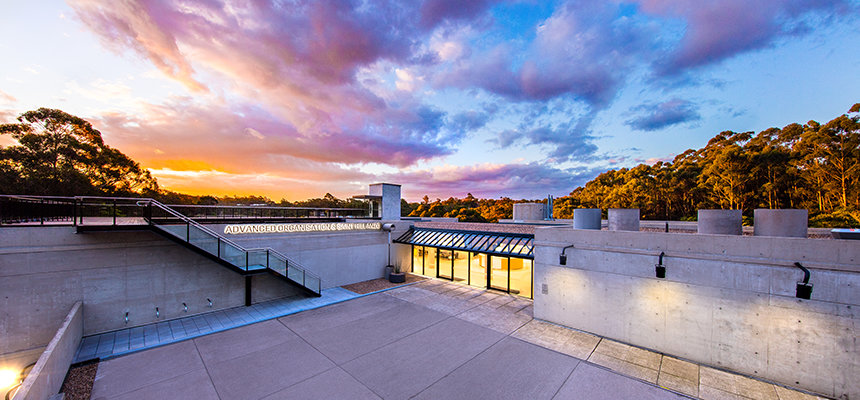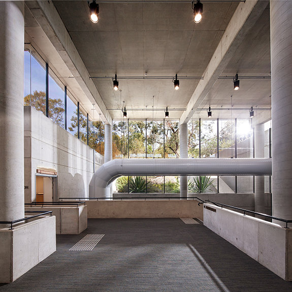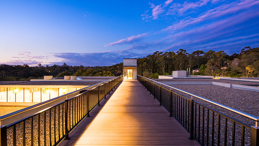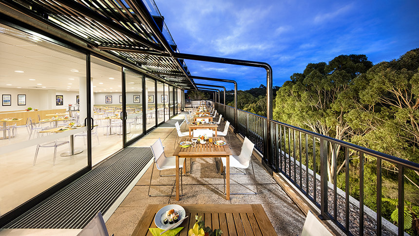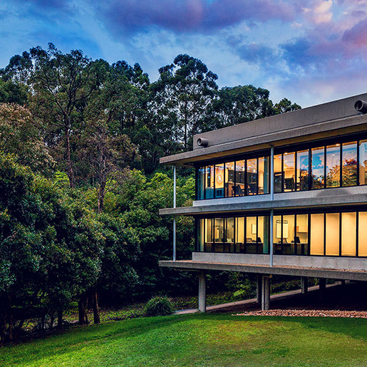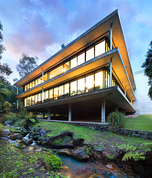 Ультрасовременное здание выполнено в стиле минимализма и представляет собой произведение современной архитектуры, бетонный фасад которого облегчают опоясывающие его стеклянные стены-окна. А снаружи через эвкалиптовый лес площадью три с половиной гектара — настоящий райский сад посреди пригородов Сиднея — протекает живописная речушка.
