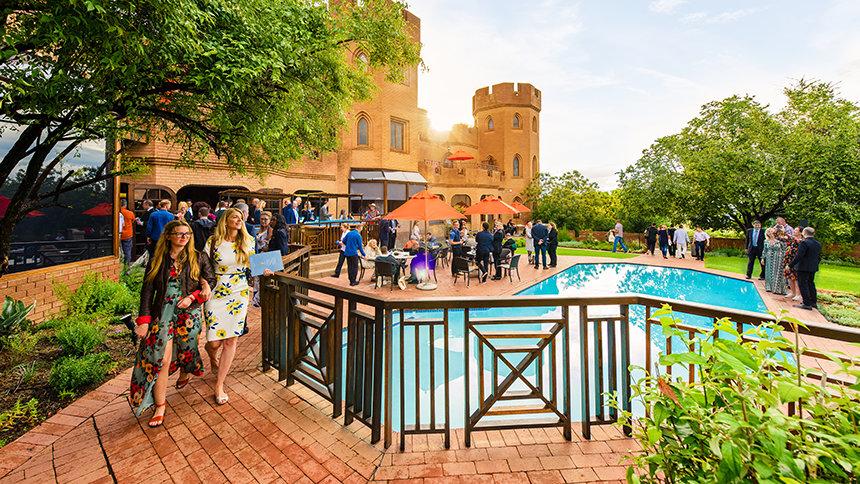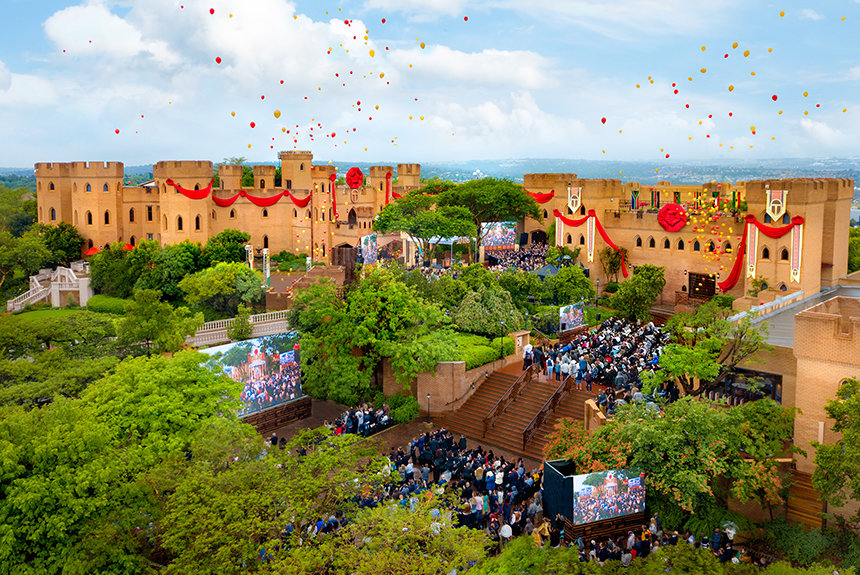 В центре этой небесной вершины, на территории в 22 гектара, возвышается замок Кьялами площадью 8000 квадратных метров – свидетельство преданности религии тому, чтобы помочь раскрыть безграничный потенциал Африки. Замок отражает волшебную ауру южноафриканского ландшафта, ведь из него открывается вид на великанов-близнецов Гаутенга – Йоханнесбург на юге и Претория на севере. Панорама захватывает внимание посетителей, в то время как в самом замке, с двенадцатью зубчатыми башнями и двадцатисантиметровыми стенами, ощущается уникальная атмосфера. Элегантный интерьер, украшенный итальянским мрамором, полученным из тех же карьеров, которые использовал Микеланджело, привносит особую атмосферу во время великолепного торжественного открытия.
