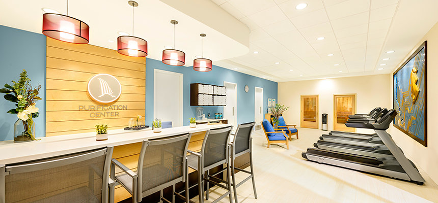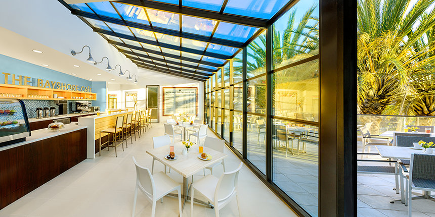 Стильное кафе со столиками как внутри, так и на открытом воздухе служит местом встречи для тех, кто посещает мероприятия, а также для прихожан, приходящих сюда в перерывах между получением саентологических услуг.