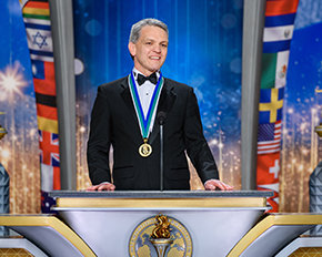 Но благодаря звёздам этого яркого и динамичного вечера раскрылось гораздо больше историй. Это были три обладателя медали Свободы МАС, каждый из которых олицетворяет неустанное и повсеместное продвижение к целям религии – спокойному продуктивному миру без преступности, где торжествует общественная справедливость. Пока г‑н Мицкевич представлял каждого из них, их истории проявляли общее этичное отношение к работе, отвагу, настойчивость и преданность: