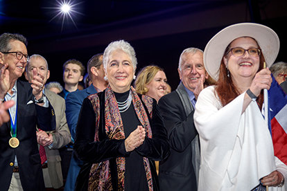 Аудитория продолжает стоять, и её приветственные возгласы эхом разносятся по залу, следуя за каждым новым достижением.