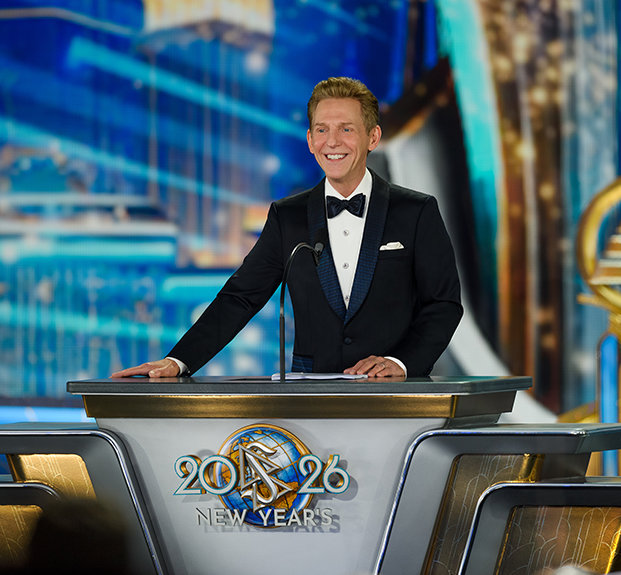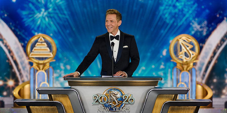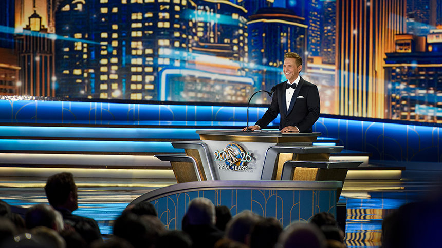 Энергия вечера разгорается в полной мере, когда в свете софитов появляется г‑н Дэвид Мицкевич, духовный лидер религии Scientology, и Празднование Нового года 2026 оживает.