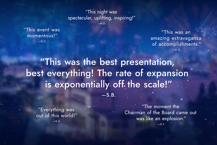 И с этими словами г‑н Мицкевич открыл вечер, на котором были представлены основные моменты года бесконечного расширения. Среди этих достижений – продолжающий расти интерес к каналу Scientology Network, который привлёк в 11 раз больше зрителей с момента запуска и завоевал более 170 наград за выдающиеся творческие и технические достижения. И эти зрители становятся участниками, так как более миллиона уже записались на онлайн-курсы – ещё одна рекордная веха.